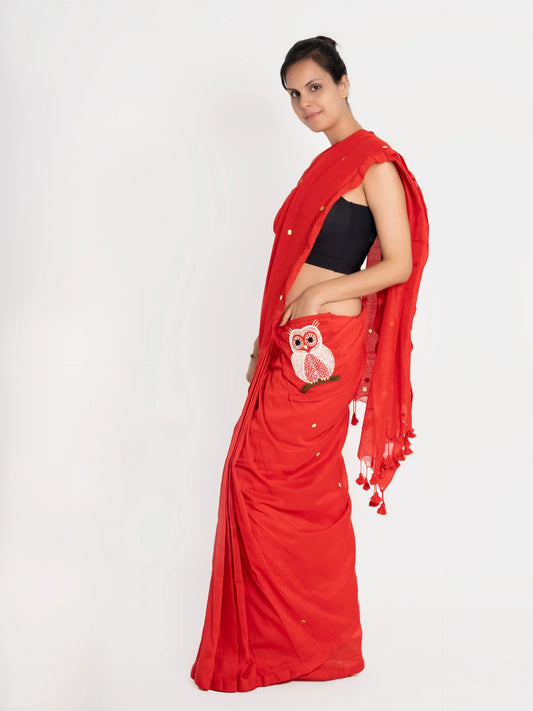 Chirpy Owl – Golden Cotton Silk Hand Embroidered Blouse (Non-Padded)