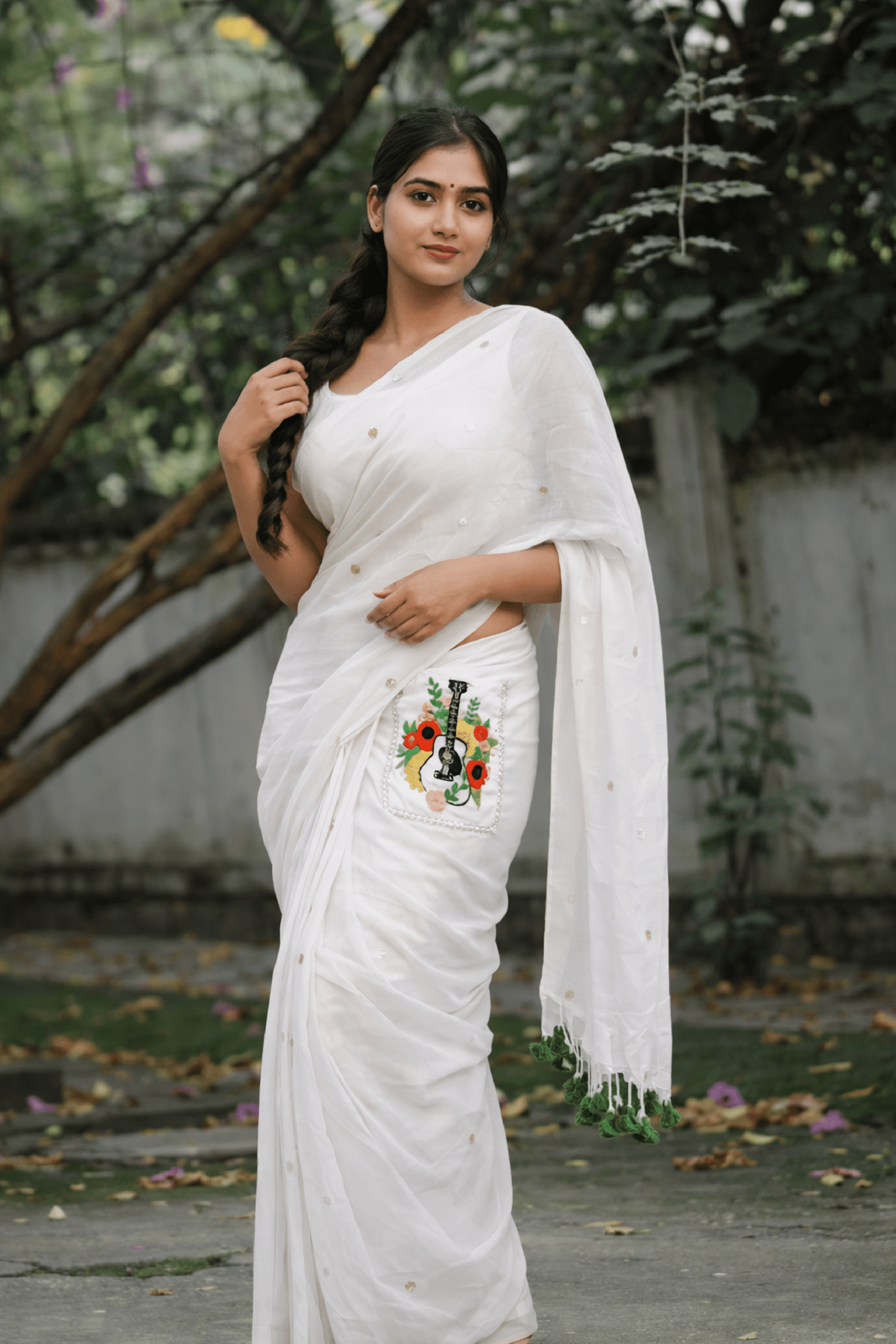 A harmonious blend of tradition and modern utility, Rhythmic Bloom is designed for the woman who values both elegance and ease. Adorned with exquisite guitar and floral embroidery, this saree carries a distinctive charm that makes it truly one-of-a-kind. Its ready-to-wear drape and thoughtfully integrated pocket let you carry essentials like your phone or keys without compromising style.